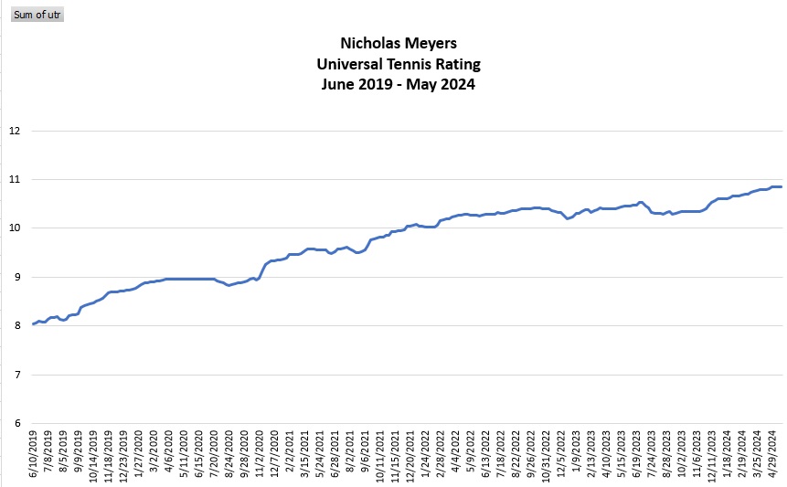 Meyers has been a top junior player and his national rankings for his class have ranged from 117 on TennisRecruiting.net (as a sophomore) to 157 (as a junior). He currently has a national ranking of 142. He sports a 10.85 UTR which is essentially his high point (10.86). His UTR range is here.
